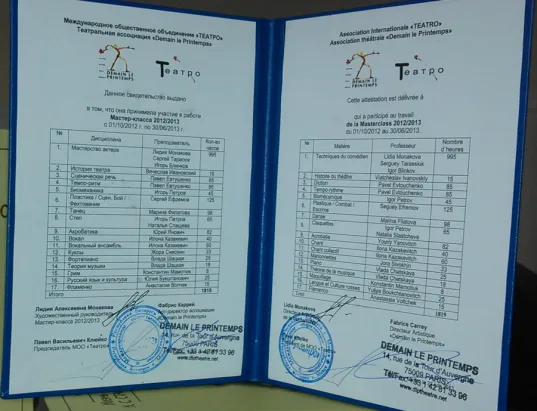 At the end of the course, Moo Teatro and Demain le Printemps have the pleasure of issuing students with a certificate of end of training.